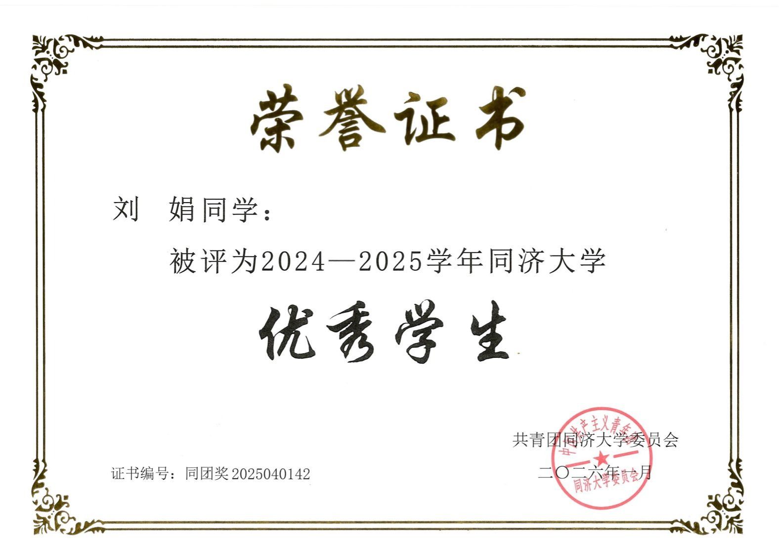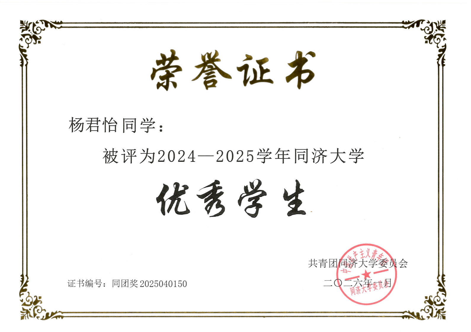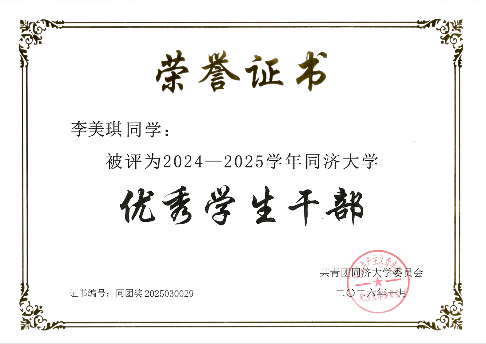 获评2024-2025学年同济大学“优秀学生干部”荣誉称号。